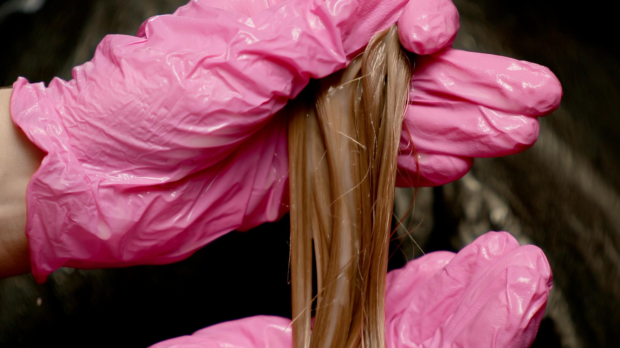 After entire section is saturated, place hair in palm of hand and